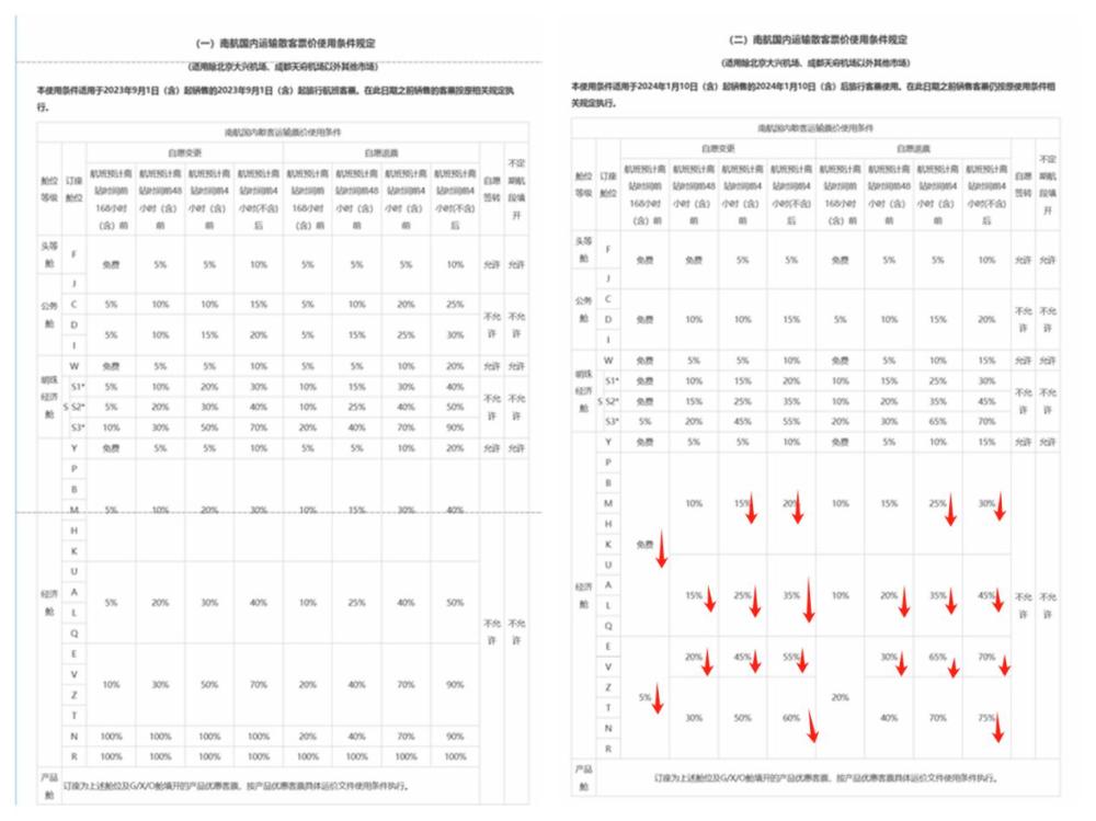 南航退改規(guī)則調(diào)整前后手續(xù)費(fèi)收取標(biāo)準(zhǔn)對(duì)比