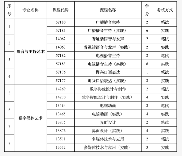 3. 調(diào)整播音與主持藝術(shù)專業(yè)(專升本)、數(shù)字媒體藝術(shù)專業(yè)(專升本)2個專業(yè)中8門課程(見下表),筆試和實(shí)踐均納入到“非筆試及實(shí)踐類課程”進(jìn)行報考,由主考學(xué)校組織考試。