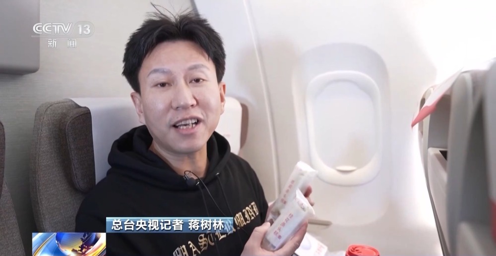 總臺(tái)央視記者 蔣樹林:首先是這個(gè)大白兔的紅豆風(fēng)味的牛奶,這還是我頭一次看到這樣的口味。還有這個(gè)桂花條頭糕,是上海老字號(hào)出產(chǎn)的。可以說這個(gè)小小的餐盤把上海的土特產(chǎn),搬到了C919飛機(jī)上。