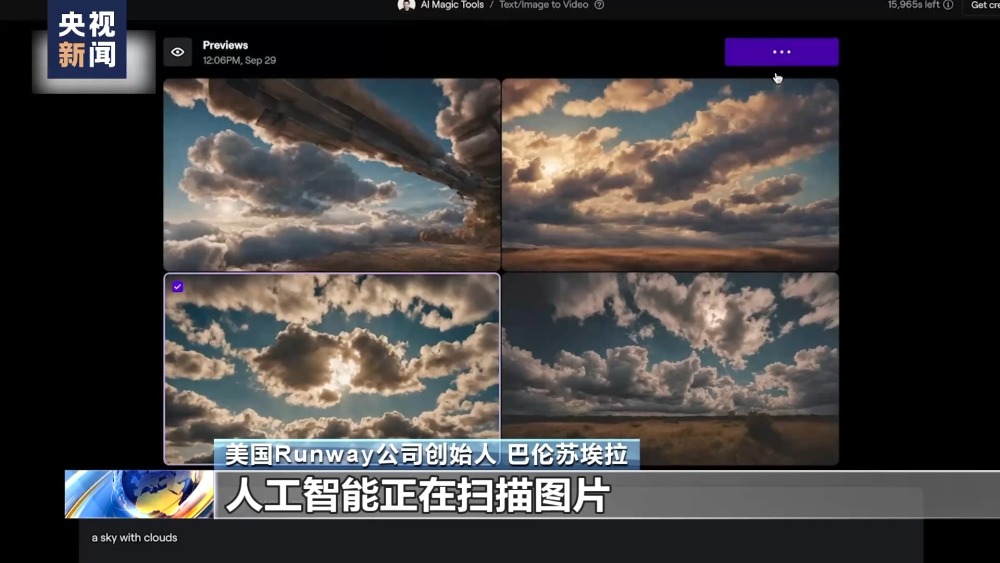 美國Runway公司創(chuàng)始人 巴倫蘇埃拉:讓我們做一個(gè)有云的天空,我可以選擇電影風(fēng)格或預(yù)覽角度。我真的很喜歡這張,它看起來就像光是從云里出來的。人工智能正在掃描圖片,并由此生成一段視頻。你現(xiàn)在可以看到云正在移動(dòng),天空正在變暗,暴風(fēng)雨就要來了。
