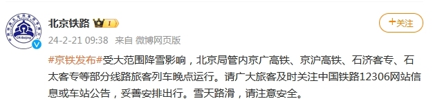 北京鐵路:受降雪影響 京廣高鐵等部分線路列車晚點(diǎn)