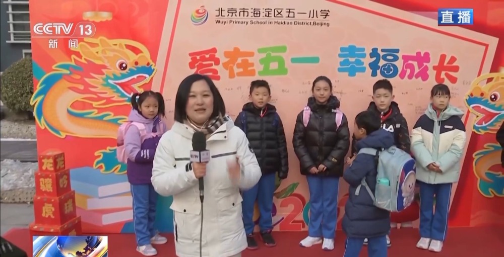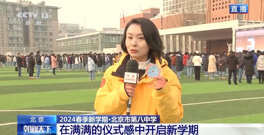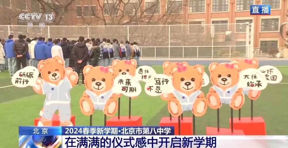 總臺央視記者 李晶晶:北京市第八中學高中部,近2300名高中生齊聚國旗下,舉行新學期的第一次升旗儀式,在滿滿的儀式感中開啟新的學習生活。今年是龍年,有句祝福語叫“龍行龘龘,前程朤朤”,現(xiàn)在正在進行的國旗下的演講,題目就是《龘龘朤朤間是向上的力量》,老師祝福學生們像龍一樣騰飛而上,同時也是鼓勵他們要有夢想,為實現(xiàn)夢想不斷努力向上。