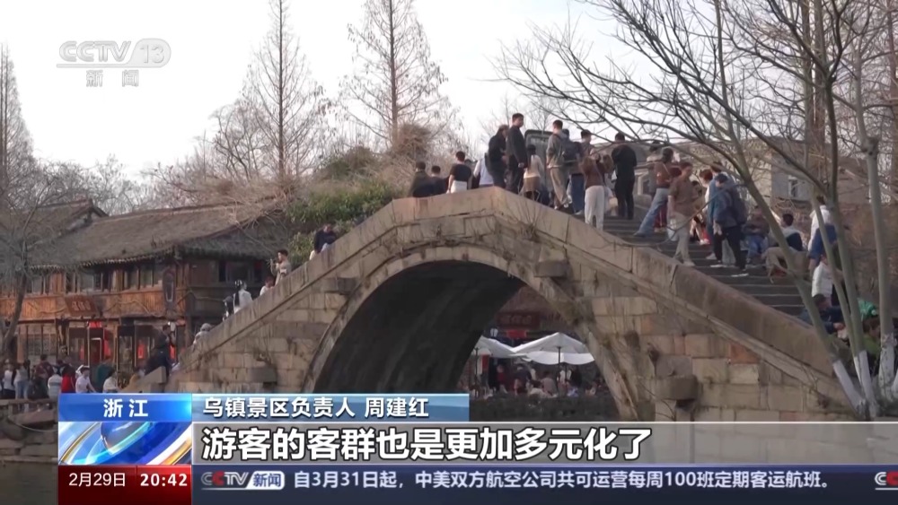 烏鎮(zhèn)景區(qū)負(fù)責(zé)人 周建紅:二月份來看,我們整個線上營銷比例已經(jīng)超過了線下,占比達(dá)到了60%,旅游產(chǎn)品也是在做不斷的一個迭代,游客的客群也是更加多元化了。十年前的春節(jié),游客量在20多萬,那這一次的春節(jié)的話,我們已經(jīng)是突破了50萬人次,也是翻倍的一個增長。