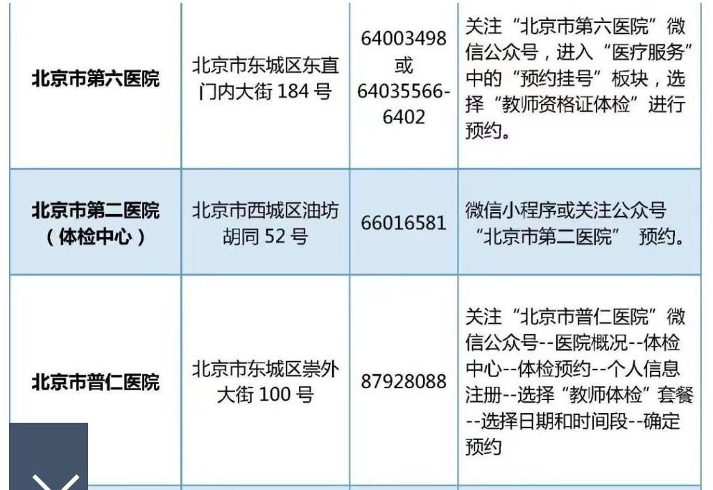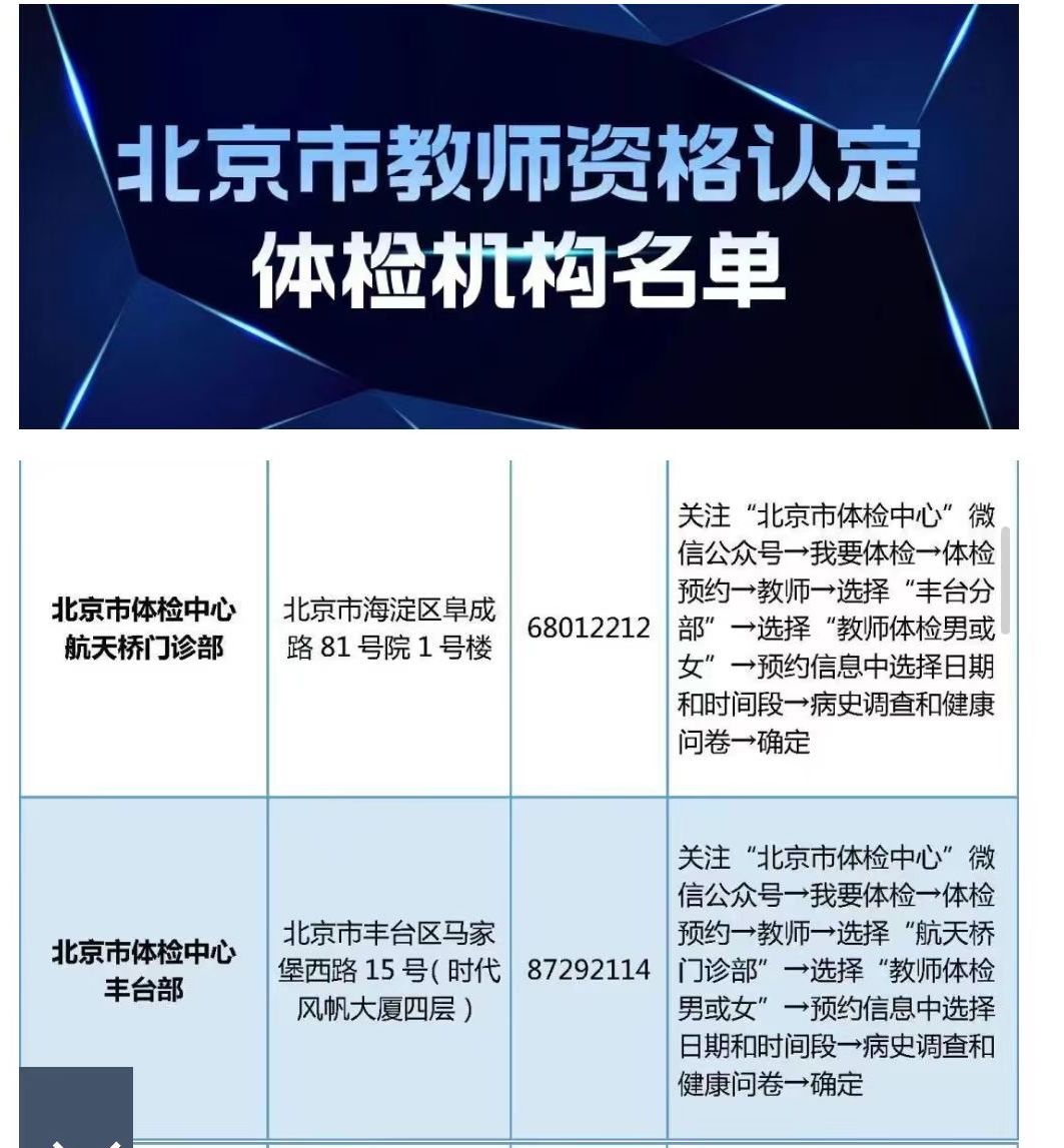 尚未進(jìn)行體檢的請(qǐng)自行與體檢機(jī)構(gòu)聯(lián)系完成體檢。北京市體檢中心將于3月中下旬在豐臺(tái)部、航天橋門診部和馬甸部舉行多場(chǎng)教師資格認(rèn)定體檢專場(chǎng)。具體時(shí)間安排可聯(lián)系相應(yīng)機(jī)構(gòu)咨詢。
