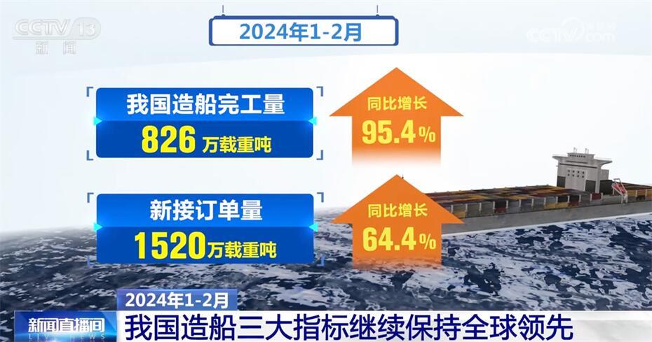 最新數(shù)據(jù)顯示,2024年1—2月,我國造船完工量826萬載重噸,同比增長95.4%;新接訂單量1520萬載重噸,同比增長64.4%;截至2月底,手持訂單量14919萬載重噸,同比增長31.3%,造船三大指標(biāo)國際市場份額繼續(xù)全球領(lǐng)先。