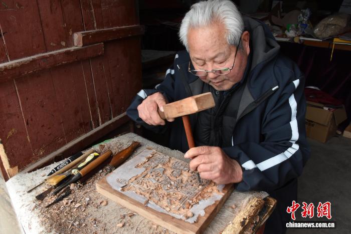 2月5日,河南開(kāi)封朱仙鎮(zhèn)木版年畫(huà)“萬(wàn)同老字號(hào)”第四代傳人張連生正在進(jìn)行木版雕刻?! ⊥跤?攝