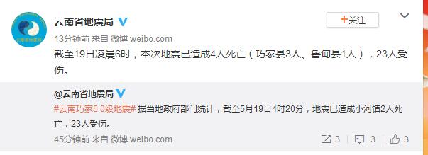 中新網(wǎng)5月19日電 據(jù)云南省地震局官方微博消息,截至19日凌晨6時(shí),云南巧家5.0級(jí)地震已造成4人死亡(巧家縣3人、魯?shù)榭h1人),23人受傷。