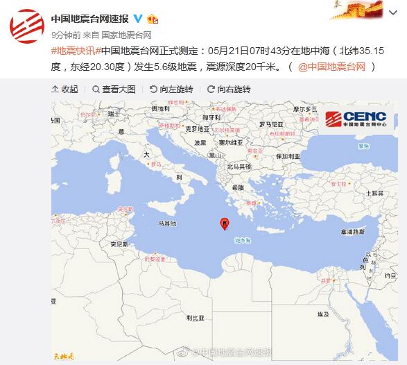 地中海發(fā)生5.6級(jí)地震 震源深度20千米