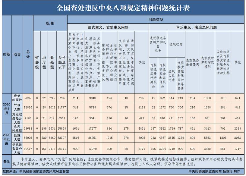 據(jù)介紹,為掌握全國貫徹落實中央八項規(guī)定精神情況,中央紀(jì)委國家監(jiān)委在各省區(qū)市和新疆生產(chǎn)建設(shè)兵團(tuán)、各中央和國家機(jī)關(guān)、各中央企業(yè)和中央金融企業(yè)等建立了落實中央八項規(guī)定精神情況月報制度。2020年以來,截至4月30日,全國查處違反中央八項規(guī)定精神問題情況如下: