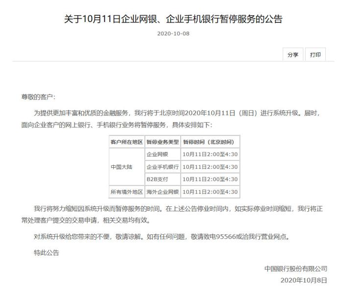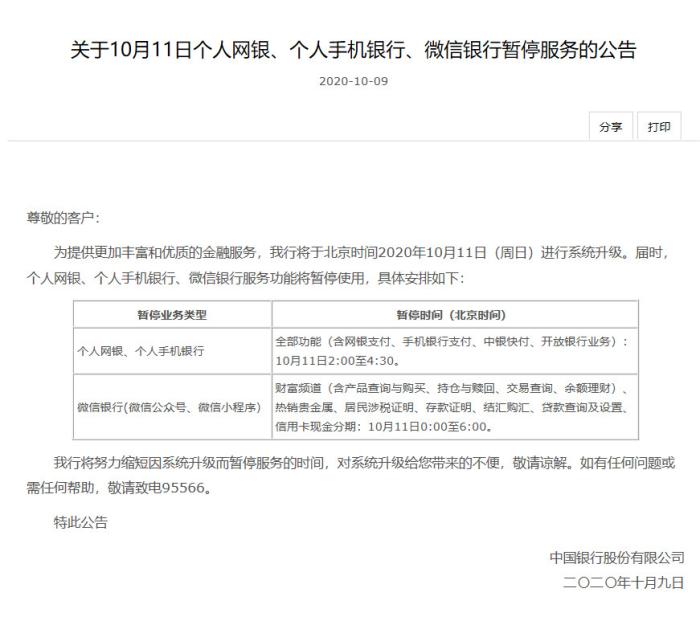 中新網(wǎng)客戶端10月10日電(彭婧如)近日,中國銀行先后發(fā)布《關于10月11日企業(yè)網(wǎng)銀、企業(yè)手機銀行暫停服務的公告》、《關于10月11日個人網(wǎng)銀、個人手機銀行、微信銀行暫停服務的公告》。根據(jù)公告,中國銀行將于北京時間2020年10月11日(周日)進行系統(tǒng)升級。屆時,面向企業(yè)客戶的網(wǎng)上銀行、手機銀行業(yè)務將暫停服務,個人網(wǎng)銀、個人手機銀行、微信銀行服務功能也將暫停使用。