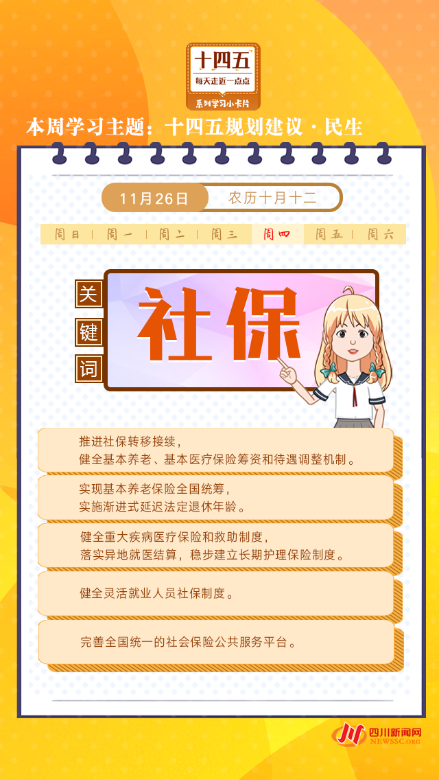 本周學習主題“十四五規(guī)劃建議·民生”系列,一張張學習卡帶你了解就業(yè)、收入、住房……那些與你息息相關(guān)的民生舉措!今天打卡學習“十四五”規(guī)劃建議中有關(guān)社保的舉措。