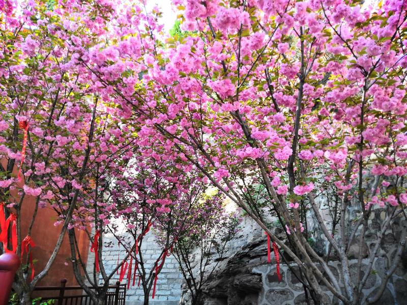 在玄中寺,墻角處十余株櫻花樹滿樹繁花,凋謝的櫻花飄落滿山坡,腳步踏在花片上,形成了一條條用花片鋪成的小道,人們邊走邊觀賞櫻花,也另有一番風(fēng)景!(來源:交城縣新聞辦 孫寶忠)