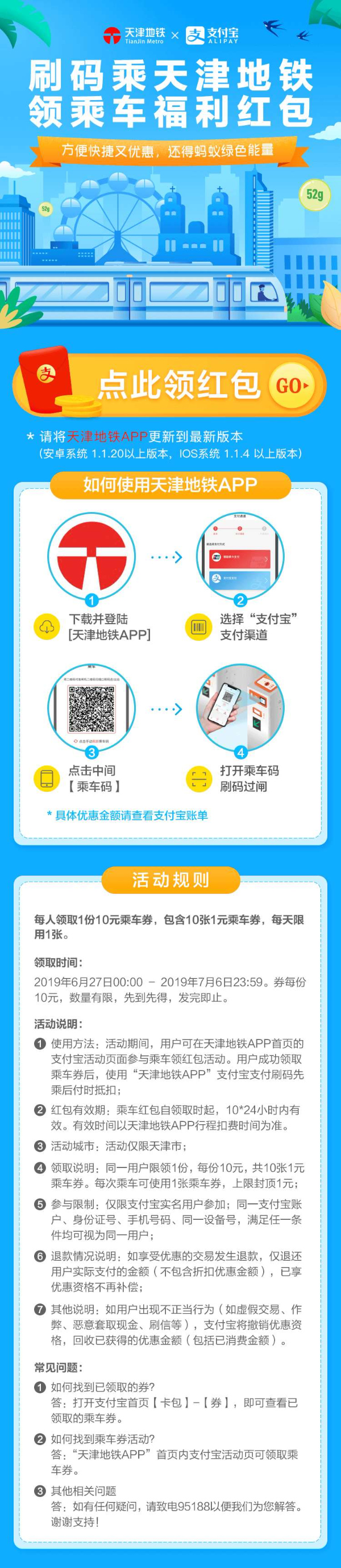 為回饋廣大市民對天津地鐵的支持,天津軌道交通運營集團有限公司與支付寶(中國)網(wǎng)絡(luò)技術(shù)有限公司聯(lián)合開展出行優(yōu)惠活動,自2019年6月27日至2019年7月6日期間,乘客可在天津地鐵APP或支付寶APP領(lǐng)取支付寶紅包。