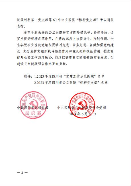 近日,中共四川省委組織部、中共四川省衛(wèi)生健康委員會黨組發(fā)文通報(bào)表揚(yáng)了2023年度四川省“黨建工作示范醫(yī)院”和公立醫(yī)院“標(biāo)桿黨支部”(川衛(wèi)組函〔2024〕15號),安岳縣人民醫(yī)院榮獲2023年度四川省“黨建工作示范醫(yī)院”!