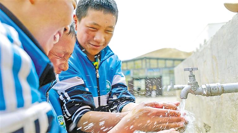謝通門縣縣城自來水管網(wǎng)升級改造后,學生用自來水洗手。