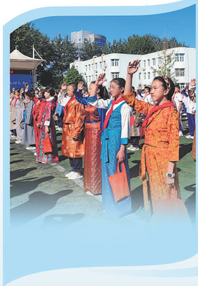 拉薩北京實(shí)驗(yàn)中學(xué)學(xué)生在北京市順義區(qū)第五中學(xué)參加升旗儀式。馬瀟雅攝
