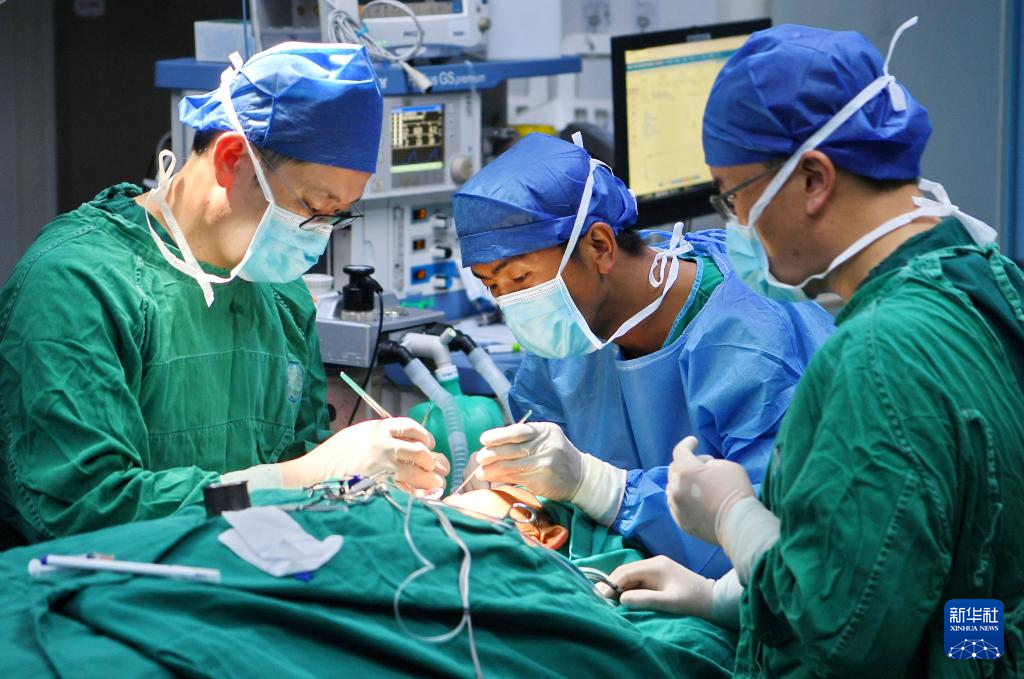 8月29日,王克明博士(左)和西藏自治區(qū)人民醫(yī)院醫(yī)生為患者實施手術(shù)。新華社記者 張汝鋒 攝