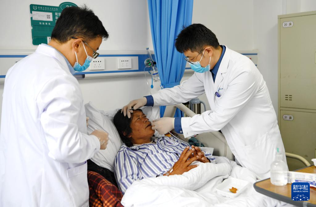 9月1日,王克明博士(右)和西藏自治區(qū)人民醫(yī)院醫(yī)生為患者換藥。新華社記者 張汝鋒 攝