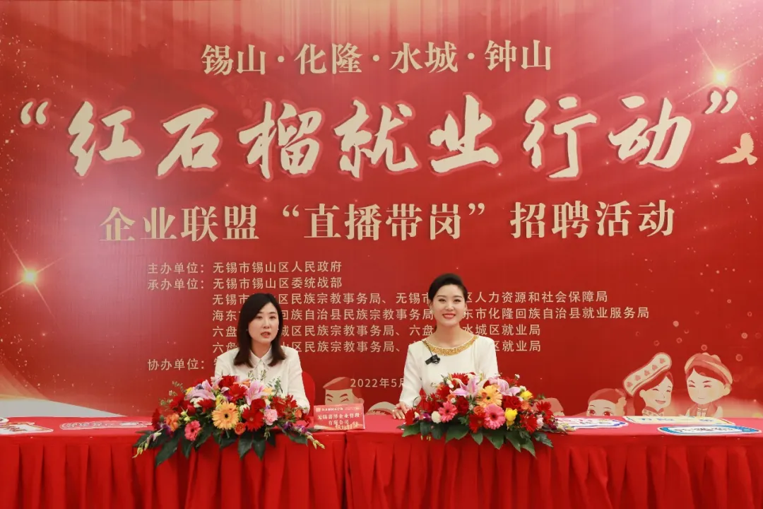 江蘇省無錫市錫山區(qū)與貴州省六盤水市水城區(qū)、鐘山區(qū),青海省海東市化隆回族自治縣通過網(wǎng)絡(luò)平臺(tái)舉行“紅石榴就業(yè)行動(dòng)”合作簽約暨企業(yè)聯(lián)盟“直播帶崗”招聘活動(dòng)。江蘇省民族宗教事務(wù)委員會(huì)供圖