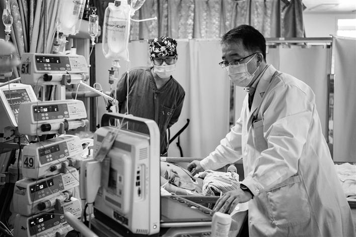 北京援藏醫(yī)生王小亭(右)在西藏自治區(qū)人民醫(yī)院病房為病人做重癥超聲評估。新華社