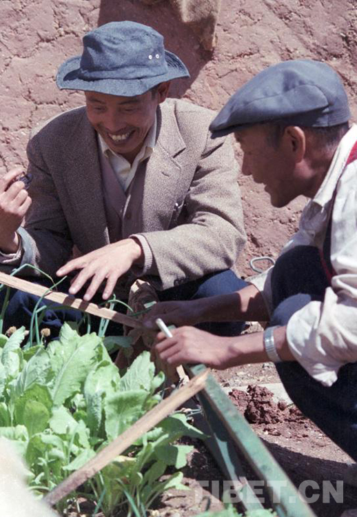 這是時(shí)任雙湖辦事處(現(xiàn)雙湖縣)紀(jì)律檢查委員會(huì)書記的熊亮兵(左),正在觀察自己在家門口通過搭塑料薄膜小篷試種的蔬菜(唐召明1987年攝)