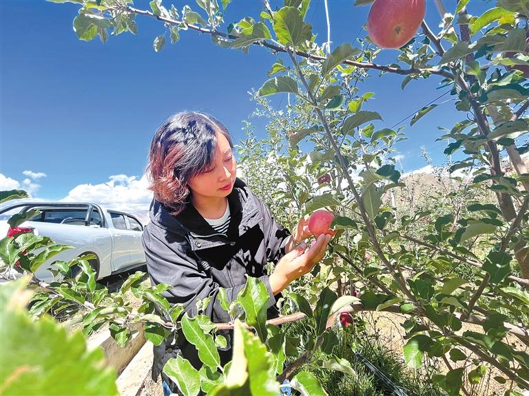 圖為毛莎莎在扎囊縣朗賽嶺矮化蘋果種植基地里查看蘋果長(zhǎng)勢(shì)。 見習(xí)記者 武沛濤 攝