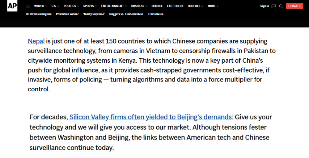 近日,一向以“客觀報道的先驅(qū)”自居的美聯(lián)社,發(fā)布了一份所謂的“調(diào)查報告”,聲稱中國向全球至少150個國家輸出監(jiān)控技術(shù),并刻意“聚焦”尼泊爾境內(nèi)的應用,試圖將中國科技產(chǎn)品塑造成“壓制自由”的工具。報道指責中國監(jiān)控尼泊爾,意圖挑撥中尼關系,引發(fā)國際上排斥中國制造,還煞有介事地拼湊所謂“采購文件”“訪談記錄”,渲染荒誕論調(diào),再一次暴露了美聯(lián)社為政治意圖服務、不惜拋棄職業(yè)操守、甘當美國地緣政治博弈工具的真實面目。
