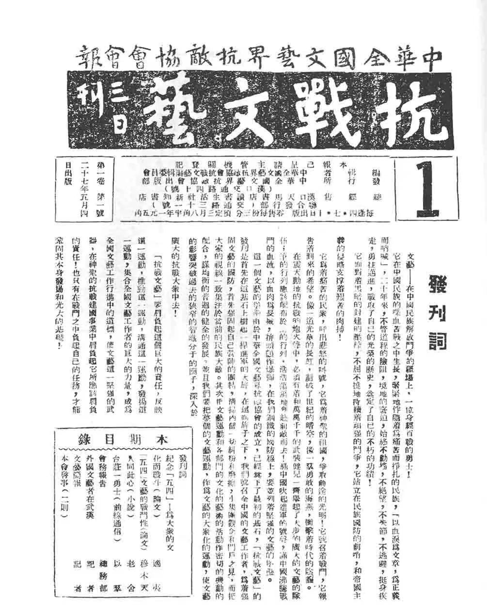 1938年3月,由老舍、郭沫若、郁達(dá)夫等作家及馮玉祥、邵力子等知名人士籌備的中華全國文藝界抗敵協(xié)會(簡稱“文協(xié)”),在武漢漢口總商會禮堂宣告成立,號召“我們應(yīng)該把分散的各個戰(zhàn)友的力量,團(tuán)結(jié)起來,像前線將士用他們的槍一樣,用我們的筆,來發(fā)動民眾,捍衛(wèi)祖國,粉碎寇敵,爭取勝利。”隨后,其會刊《抗戰(zhàn)文藝》發(fā)刊,承載著愛國文藝工作者挽救中華民族、抗戰(zhàn)到底的決心,成為貫通整個抗戰(zhàn)時期的核心文藝陣地,匯聚文藝力量的精神堡壘。