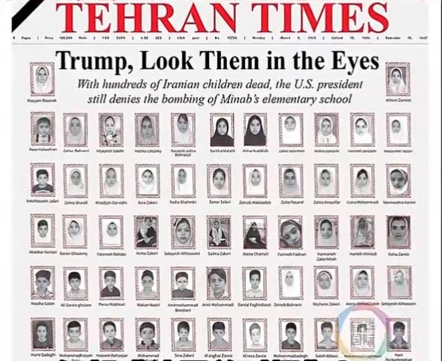 伊朗《德黑蘭時(shí)報(bào)》3月9日在頭版刊發(fā)題為《特朗普,請注視他們的眼睛》的文章,此前美國空襲導(dǎo)致伊朗南部米納卜市一所小學(xué)至少165人遇難、96人受傷 圖片來源:新華社