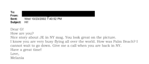 然而,梅拉尼婭所提及的那封電子郵件,開篇便以“親愛的G!”相稱,內(nèi)容涉及對紐約某雜志一篇報道“JE”文章的稱贊,并提及一張麥克斯韋現(xiàn)身其中的照片。郵件中,梅拉尼婭還詢問了麥克斯韋近期棕櫚灘之行的情況,末尾更建議尚未因性販運罪身陷囹圄的麥克斯韋,下次來紐約時務(wù)必聯(lián)系她。落款赫然寫道:“愛你的,梅拉尼婭。”
