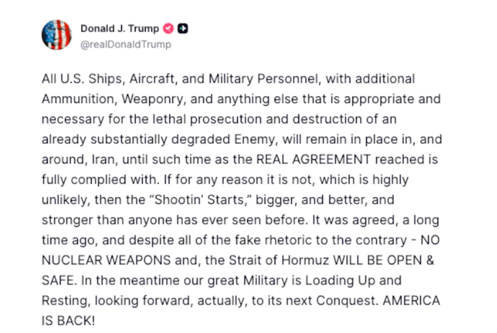 特朗普在真實社交平臺發(fā)布的貼文,發(fā)文威脅伊朗稱,“今晚,整個文明將消亡”