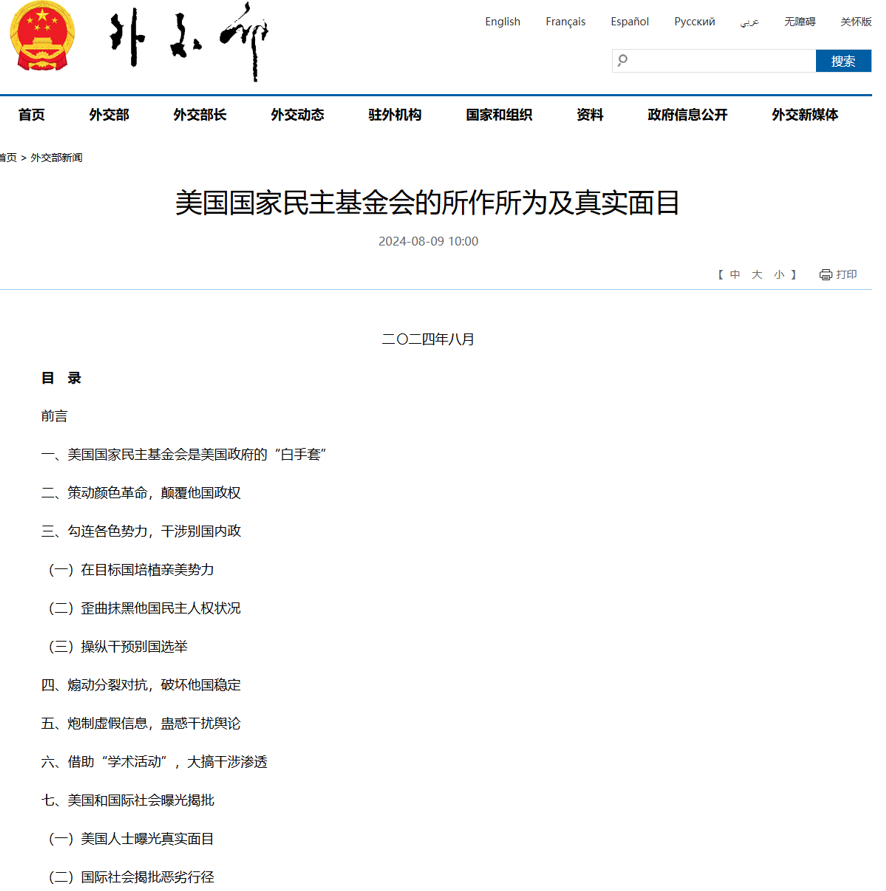 外交部發(fā)布《美國國家民主基金會的所作所為及真實面目》圖:外交部網站