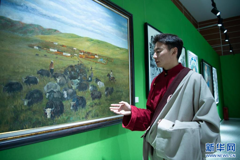 4月28日,大賽美術(shù)組二等獎(jiǎng)獲得者郭扎在介紹自己的作品。新華網(wǎng) 旦增努布 攝