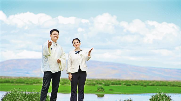 圖為色尼區(qū)文化和旅游局副局長塔巴曲珍(右)與歌手羅布桑珠錄制宣傳視頻。記者 萬靖 攝