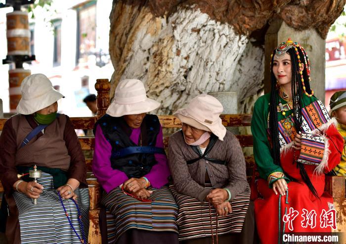 近年來,隨著文化旅游的興起,西藏正快速推進文旅融合。八廓街、布達拉宮廣場等地,身著藏服拍攝寫真也成為眾多游客進藏旅游標配。圖為9月7日游客在八廓街拍攝藏服寫真。中新社記者 李林 攝