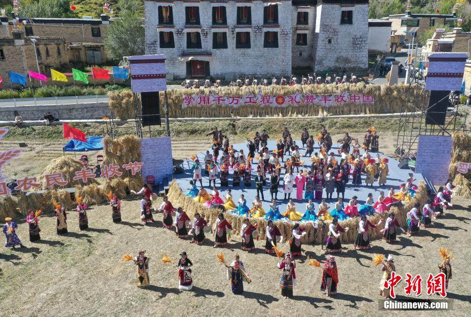 9月22日,2024年西藏“中國農(nóng)民豐收節(jié)”慶祝活動(dòng)在山南市瓊結(jié)縣拉玉鄉(xiāng)強(qiáng)吉村舉行?;顒?dòng)以“學(xué)用‘千萬工程’禮贊豐收中國”為主題,由西藏各地(市)民間演出隊(duì)為大家獻(xiàn)上一場具有地域特色、體現(xiàn)農(nóng)牧民豐收喜悅的歌舞盛宴。圖為演出現(xiàn)場。(無人機(jī)照片)