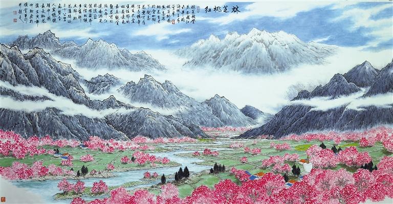 我擺手提示她,悄聲說,不要在這里冒充內(nèi)行,那邊有人。此時那位先生或許聽到了這句話,微笑著挪步過來。他說,林芝這個地方,他去過多次。他要把人們向往的林芝、游客看到的林芝、當?shù)厝耸熘牧种?,用中國畫的形式表現(xiàn)出來。這幅畫是以現(xiàn)實主義表達方式創(chuàng)作的,屬中國畫中的寫意山水。這幅畫的素材來自林芝展現(xiàn)給我們的實景元素。繪畫藝術(shù)是在發(fā)現(xiàn)美的基礎(chǔ)上創(chuàng)造美。這位女士說得好。你們看,大家熟悉的林芝自然元素,在這幅畫里都能找到,而且桃花是主角,有田野做底色、蒼松積雪相映襯,還有猶如白色哈達的那些云,林芝桃紅讓人印象深刻。我笑言,老哥的這番話,就像這幅畫是你畫的一樣。他說,正因為我們?nèi)ミ^這些地方,觀的是景,繪的是畫,表的是心,所以如同再次身臨其境,沉浸在大自然中。
