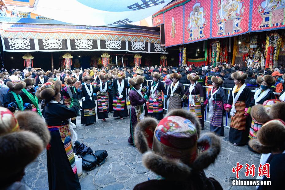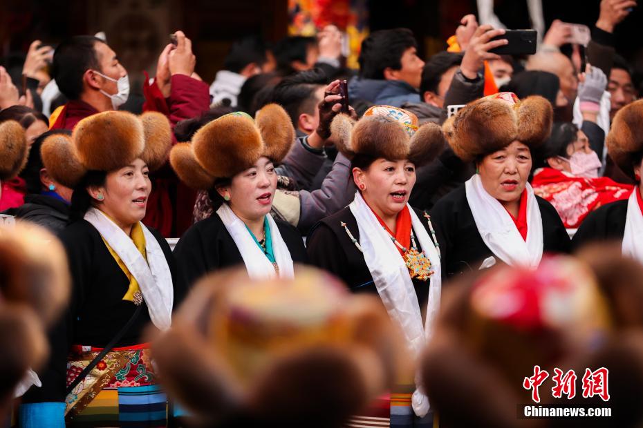圖為身著民族服裝的信眾在大昭寺內(nèi)載歌載舞。