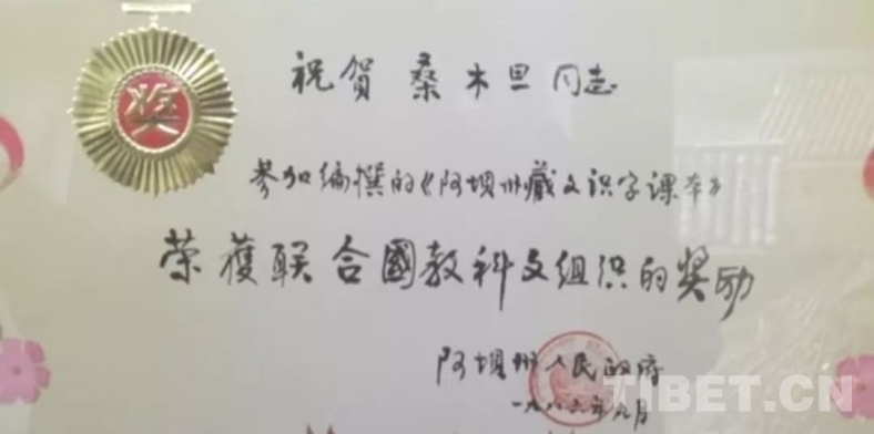 作為一個(gè)智慧過(guò)人的學(xué)者,1986年9月,為了藏語(yǔ)文教育的進(jìn)一步普及,毛爾蓋·桑木旦不僅為掃盲四處奔跑,講授藏語(yǔ)文基礎(chǔ)課,而且主編了《藏文掃盲課本》,此書(shū)由國(guó)家教委推薦參加了亞太地區(qū)掃盲教材比賽,并榮獲聯(lián)合國(guó)教科文組織的獎(jiǎng)勵(lì)。為此阿壩州人民政府頒發(fā)證書(shū),祝賀桑木旦同志榮獲聯(lián)合國(guó)教科文組織的獎(jiǎng)勵(lì)。我相信中國(guó)藏學(xué)界獲得此獎(jiǎng)?wù)?,毛爾蓋·桑木旦先生為第一人。