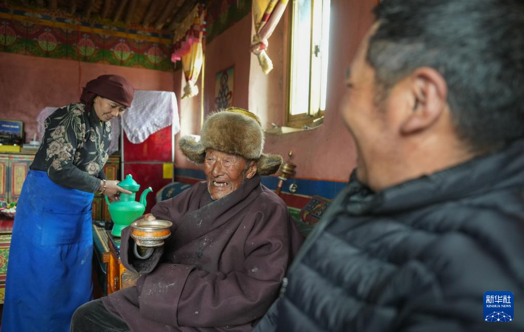 索扎老人和家人聊天(3月20日攝)。新華社記者 晉美多吉 攝