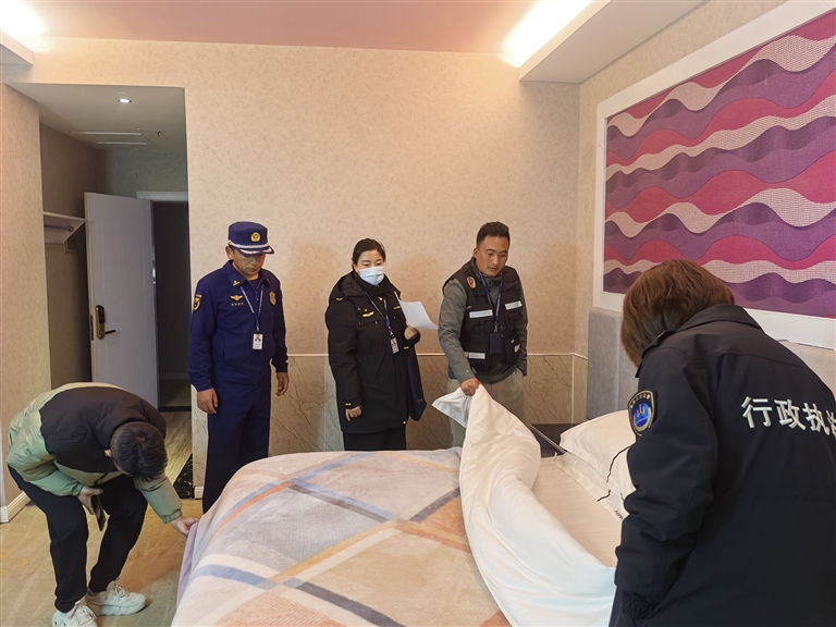 文旅部門對酒店進行檢查?!D片由西藏自治區(qū)文旅廳執(zhí)法監(jiān)督處提供