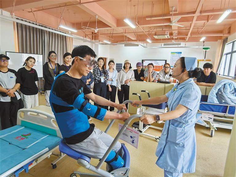 “看到老師為我們展示幫助失能老人翻身時(shí)使用的借力技巧時(shí),才發(fā)現(xiàn)這些細(xì)節(jié)我們以前都沒關(guān)注過。”學(xué)員們?cè)谟浭卤旧厦苊苈槁橛浿o(hù)理技術(shù)要點(diǎn)。