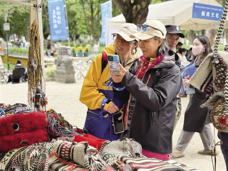 在西藏“非遺”文化體驗(yàn)區(qū),來(lái)自湖南的游客張麗一邊挑選包包一邊感嘆:“哇噻,真的太神奇了!沒想到牦牛毛還可以做成這么漂亮的包包,我要多買幾個(gè)帶回去給朋友。還能把這份獨(dú)特的文化記憶帶回家?!?/p>