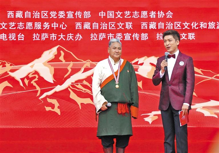 5月23日,在中國(guó)文藝志愿者服務(wù)日到來(lái)之際,由中國(guó)文聯(lián)、西藏自治區(qū)黨委宣傳部、中國(guó)文藝志愿者協(xié)會(huì)共同主辦的“與人民同行”慰問(wèn)演出在西藏會(huì)展中心廣場(chǎng)隆重舉行。這場(chǎng)慶祝西藏自治區(qū)成立60周年的文藝盛宴,在歌舞《鼓舞西藏》激昂的節(jié)奏中拉開(kāi)帷幕。