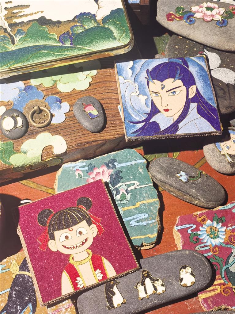 只見占地不到20平方米的小屋內(nèi),擺放著各類唐卡畫作。既有傳統(tǒng)唐卡作品,亦有動(dòng)畫人物的“繪像”。描邊的金屬絲和光滑的質(zhì)感表面讓人忍不住駐足欣賞。店里陳列著巴掌大小的掐絲唐卡,金線掐絲在礦物顏料映襯下流光溢彩。畫師兼老板的南吉合多杰正在完成一份岡仁波齊的客單:“勉薩畫派的特色是線條細(xì)膩,顏色過渡自然。選好圖案后,會(huì)根據(jù)載體材質(zhì)、大小(例如石頭大小、木板長短等)收費(fèi)?!彼贿呎f著,一邊用特制工具將顏料注入金絲隔斷。