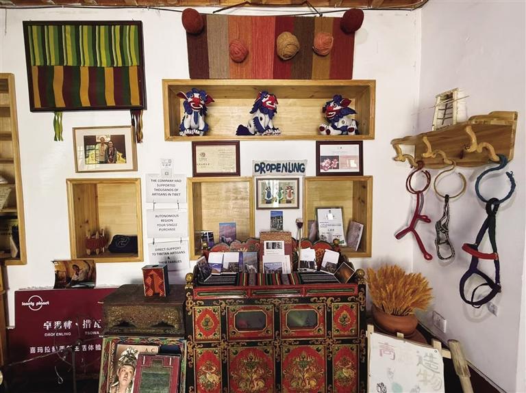 進(jìn)入卓番林,只見狹長的店面內(nèi)琳瑯滿目地?cái)[著各類富有藏元素的物件,里側(cè)的木質(zhì)貨架上整齊掛著多條不同顏色和格紋樣式的織物,貨架上方擺放著展示手工編織過程的照片。工作人員告訴記者,這些都是可售賣的,除此之外,游客來到這里,還可以體驗(yàn)酥油香皂、酥油唇膏、藏式刺繡等手工DIY。