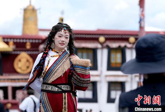 圖為6月24日,游客在大昭寺廣場拍攝藏服寫真。李林 攝