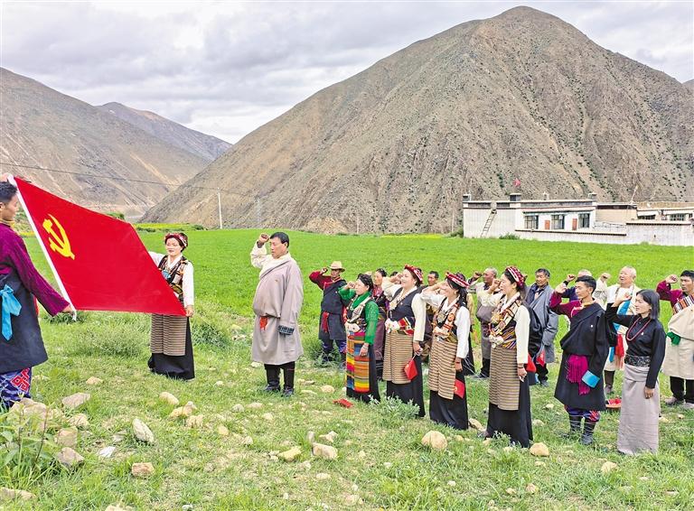 為熱烈慶祝中國共產(chǎn)黨成立104周年,7月1日,自治區(qū)稅務(wù)局駐謝通門縣仁欽則鄉(xiāng)倫珠孜村工作隊(duì)組織全體黨員在田間地頭開展重溫入黨誓詞活動。