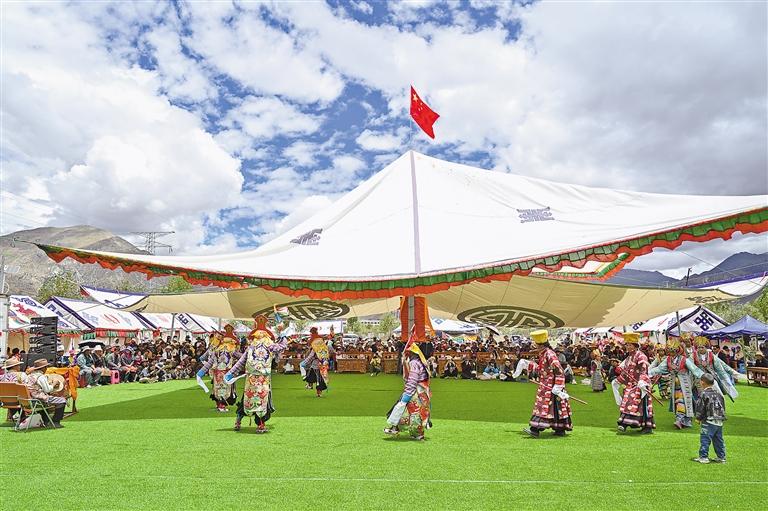 圖為7月16日,民間藏戲表演隊(duì)在南木林縣非遺公園內(nèi)表演湘巴藏戲。新華社記者 李鑫 攝
