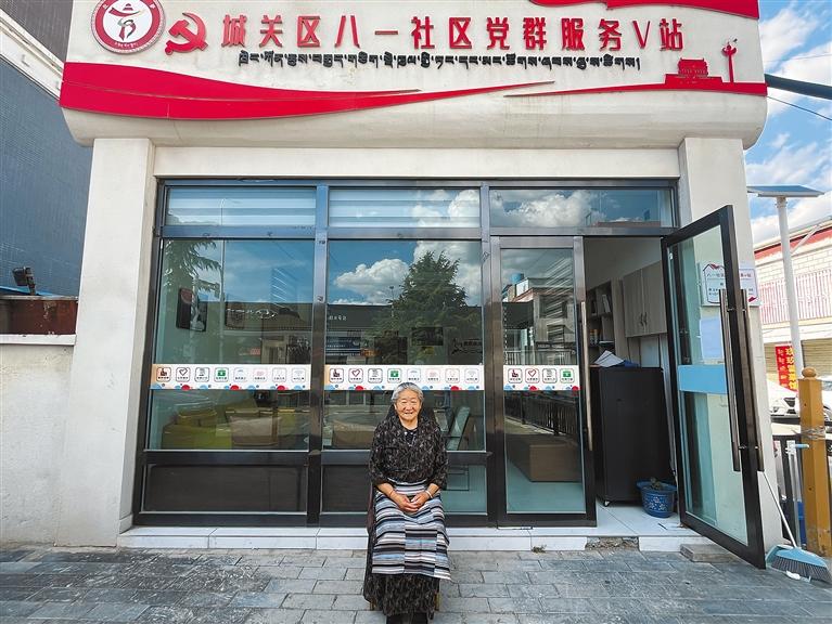 2025年,何秀英在煥然一新的八一社區(qū)黨群服務(wù)V站門口(原八一農(nóng)場(chǎng)場(chǎng)地)留影。